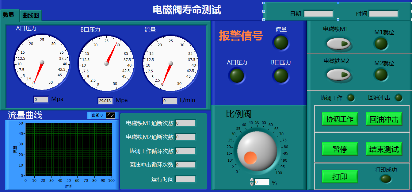 航空電磁閥測試臺是集電液伺服測試技術(shù)、液壓技術(shù)、機械、電氣技術(shù)等于一體的電液伺服測試裝備。能夠完成電磁閥的壽命測試試驗。